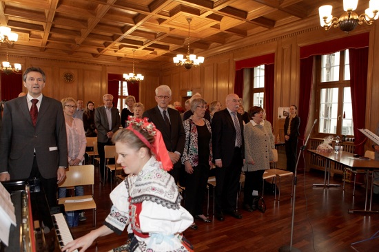 Slávka Müllerová hraje na klavír- zachyceno při zpěvu české a slovenské hymny